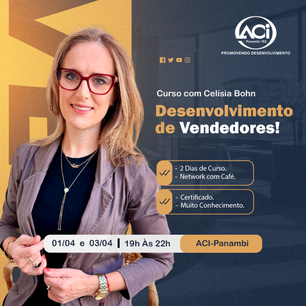 Prezados Associados! A ACI Panambi convida você para o curso Desenvolvimento de Vendedores com Celísia Bohn. Aprenda técnicas essenciais para melhorar sua abordagem, negociação e fechamento de vendas. Desenvolva suas habilidades e venda mais! 📆 Datas: 01/04 e 03/04⏰ Horário: 19h às 22h📍 Local: ACI Panambi 💰 Investimento: Associados: R$ 296,00Não associados: R$ 518,00📜 Certificado […]