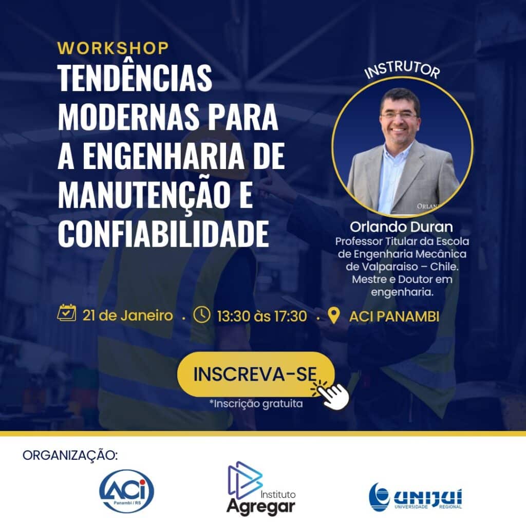No dia 21 de janeiro, o Professor Orlando Duran, Doutor em Engenharia e Professor Titular da Escola de Engenharia Mecânica da Pontifícia Universidade Católica de Valparaíso (PUCV Chile), estará na ACI Panambi para ministrar o workshop “Tendências Modernas para a Engenharia de Manutenção e Confiabilidade”.Com 30 anos de experiência, mais de 60 artigos publicados e […]