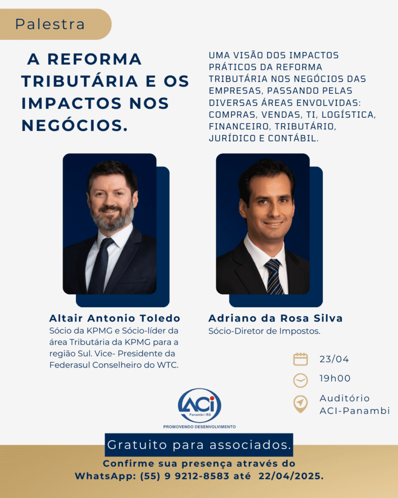 A ACI Panambi promove uma palestra essencial para empresários e gestores que querem entender os impactos reais da Reforma Tributária nos negócios. Com a presença de dois especialistas da KPMG: • Altair Antonio Toledo – Sócio da KPMG e Sócio-líder da área Tributária da região Sul •Adriano da Rosa Silva – Sócio-Diretor de Impostos Data: […]