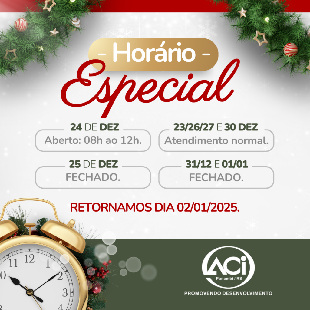 “🎄✨ Confira nosso horário especial de fim de ano! ✨🎄🗓 23, 26, 27 e 30/12: Atendimento normal.🕒 24/12: Aberto das 08h às 12h.❌ 25/12, 31/12 e 01/01: Fechado.✅ Retornamos com nossas atividades normais no dia 02/01/2025. Desejamos a todos um Feliz Natal e um próspero Ano Novo! 🎅🎆