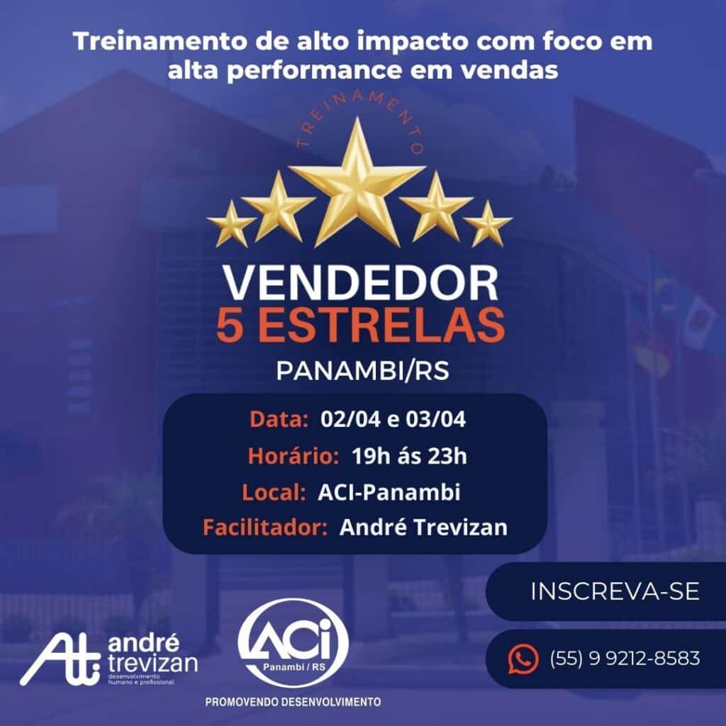 A ACI-Panambi tem o prazer de convidar você para o treinamento Vendedor 5 Estrelas com o renomado André Trevizan. Prepare-se para elevar suas habilidades de vendas a um novo patamar!