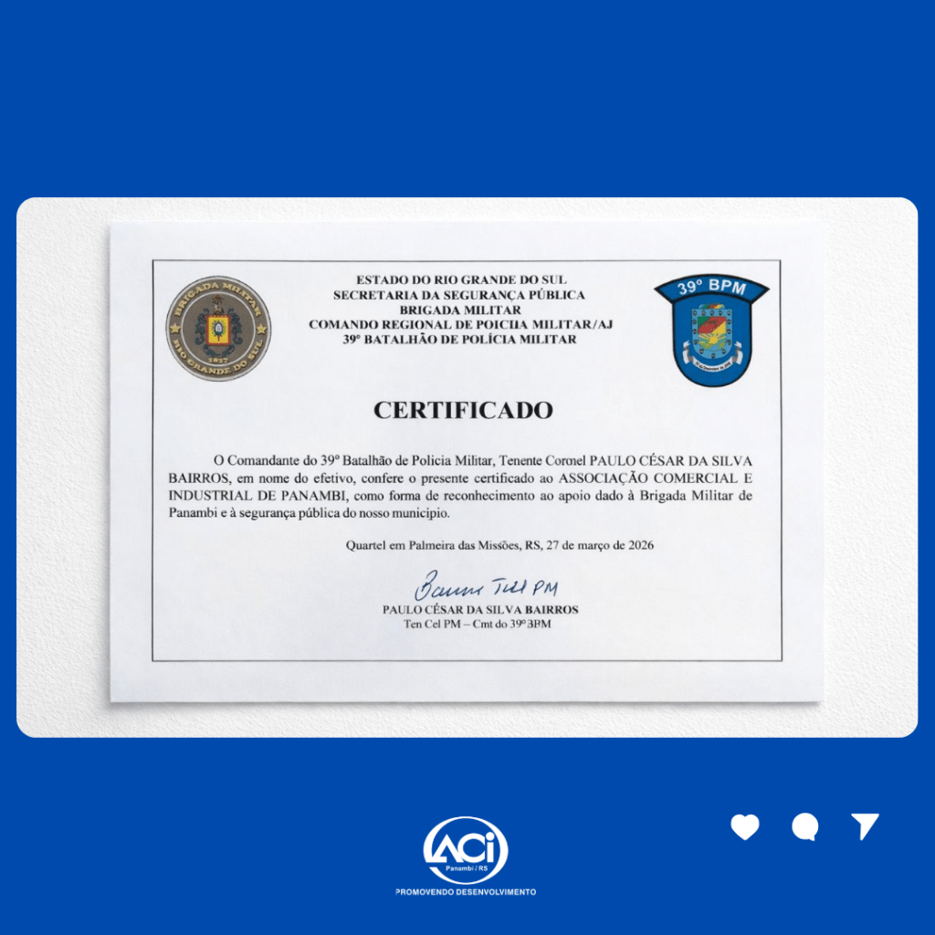 Na ocasião, a ACI foi homenageada com um certificado de reconhecimento pelo apoio prestado à Brigada Militar e à segurança pública do nosso município.